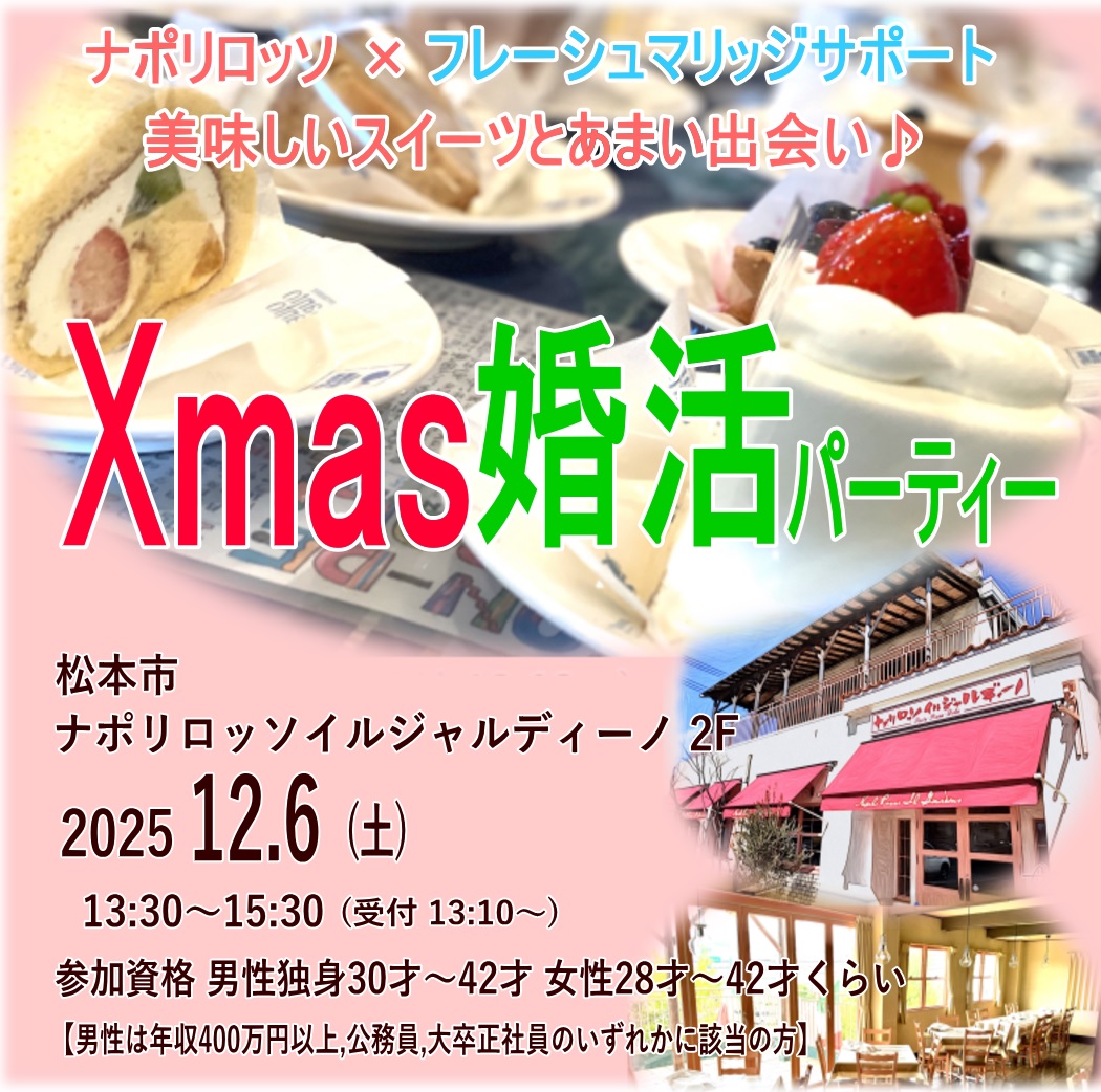 | 会 場:松本市 ナポリロッソ イル ジャルディーノ 時 間:13:30〜15:30(13:10開場) 参加資格:男性 30〜42才くらい 女性 28〜42才くらい 【男性は年収400万円以上 or 公務員 or 大卒正社員】 募集人数:男女各5〜10名程度 参加費:男性7,000円 女性2,000円 → パーティー詳細 女性HPお申込み価格♪ |