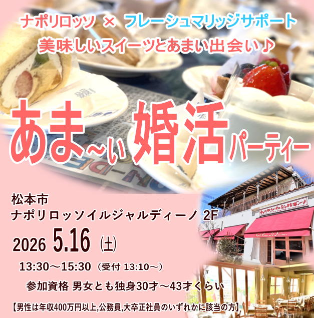 | 会 場:松本市 ナポリロッソ イル ジャルディーノ 時 間:13:30〜15:30(13:10開場) 参加資格:男性 30〜43才くらい 女性 27〜43才くらい 【男性は年収400万円以上 or 公務員 or 大卒正社員】 募集人数:男女各5〜10名程度 参加費:男性7,000円 女性2,000円 → パーティー詳細 女性HPお申込み価格♪ |